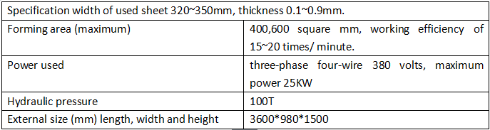 Paraiméadar teicniúil Meaisín Déanamh Síolú Tráidire Naíolainne Leithead sonraíochta an chláir a úsáidtear: 300~320mm, tiús: 0.8~2mm. Limistéar foirmithe (uasmhéid): 400 * 600 mm, éifeachtacht oibre 15 ~ 20 uair / nóiméad. Cumhacht a úsáidtear: trí phas ceithre-sreang 380 volta, cumhacht uasta 25KW Brú hiodrálacha: 100T Méid seachtrach (mm) fad, leithead agus airde) 3600mm * 980mm * 1500mm