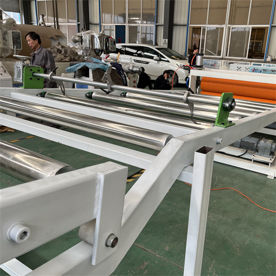 Trealamh Boird Frithstatach PVC: Is éard atá sa trealamh go príomha ná easbhrúiteoir scriú aonair 120, féilire trí-sorcóir, lúibín fuaraithe, meaisín tarraingthe sorcóir rubair, meaisín lomadh, agus gléas crios iompair. Is é 1000mm leithead caighdeánach táirge trealaimh painéil chúl turtar PVC. Is é 6mm an tiús. Is féidir le trealamh boird easbhrúiteora fhrithstatach PVC uigeachtaí éagsúla a tháirgeadh, mar shampla patrún turtar, patrún craiceann oráiste, agus patrún seiceála. Is féidir trealamh boird turtar PVC a phróiseáil agus a shaincheapadh de réir riachtanais an chustaiméara.