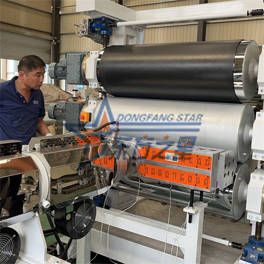 Trealamh Easbhrúiteora Bileog Frithstatach PVC : Tá an trealamh comhdhéanta den chuid is mó de 120 easbhrúiteoir scriú aonair, féilire trí-sorcóir, lúibín fuaraithe, meaisín tarraingthe sorcóir rubair, meaisín lomadh, agus a