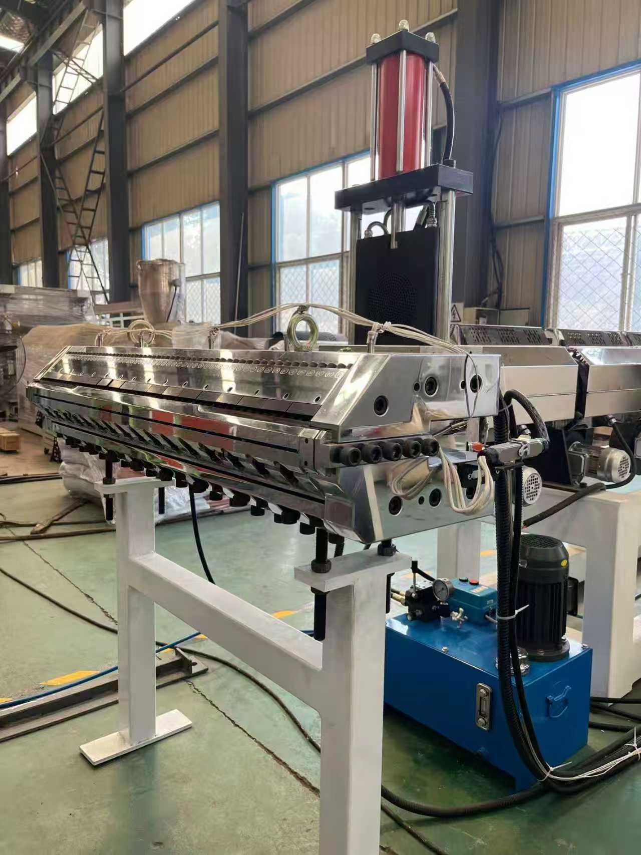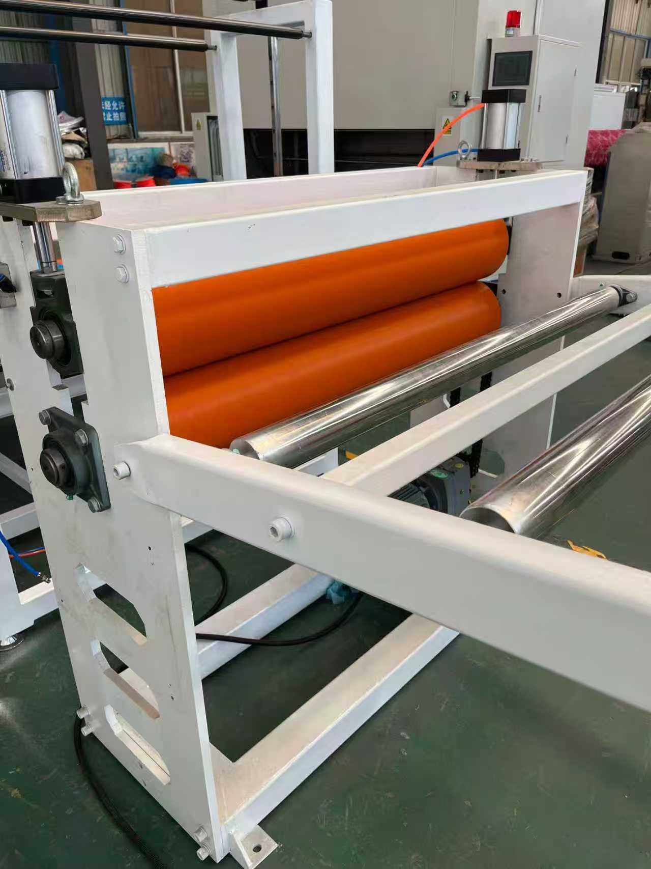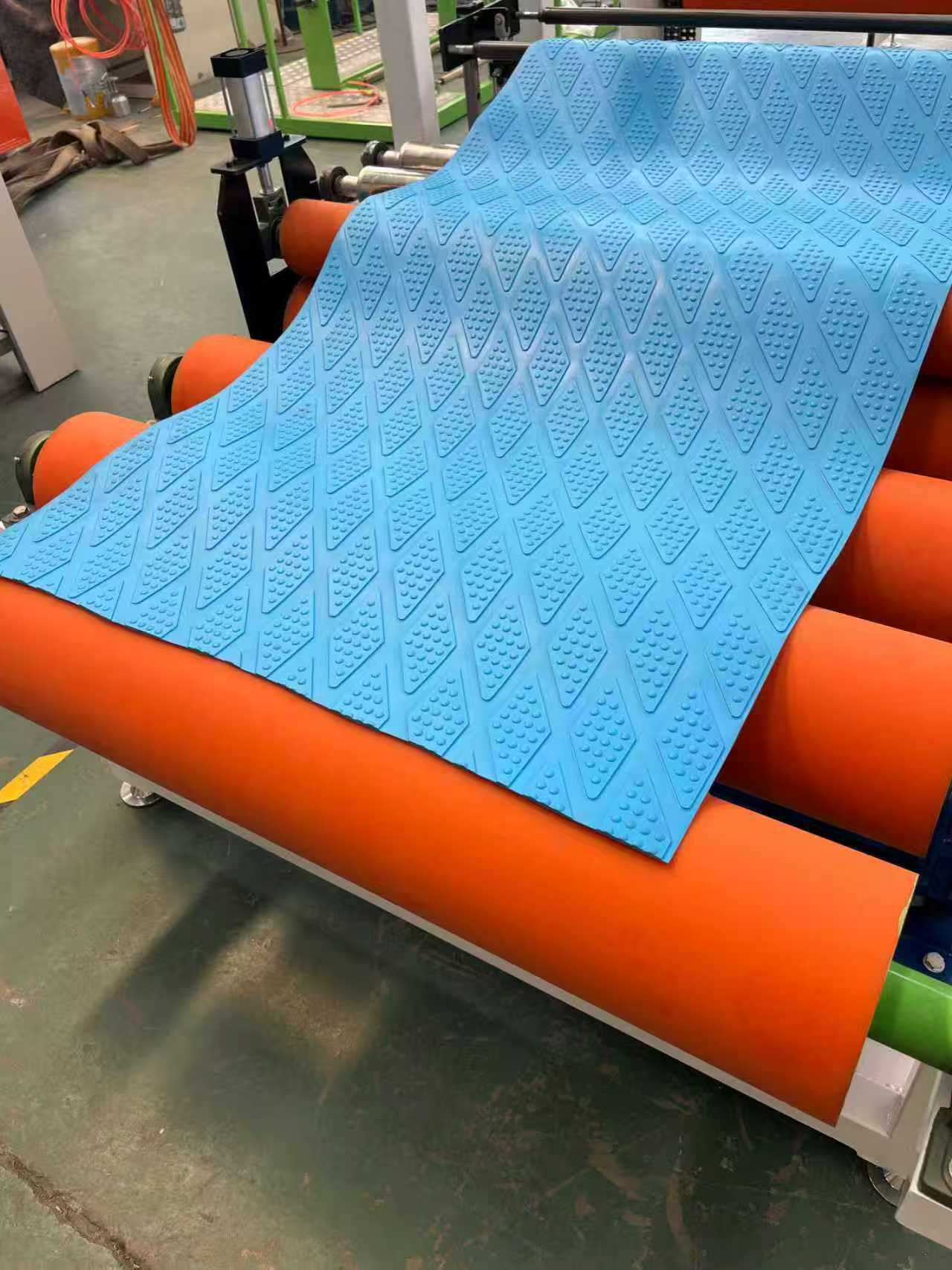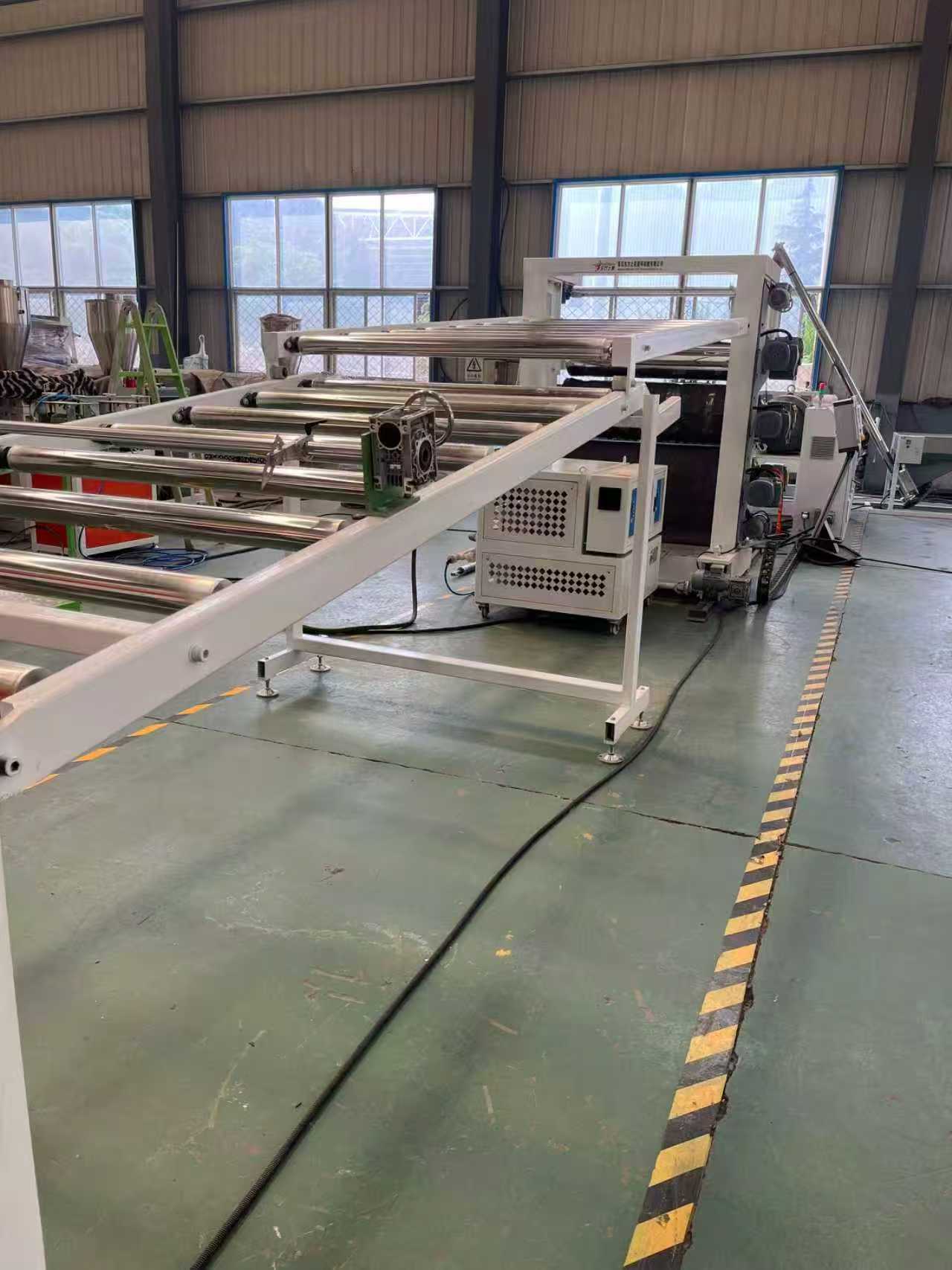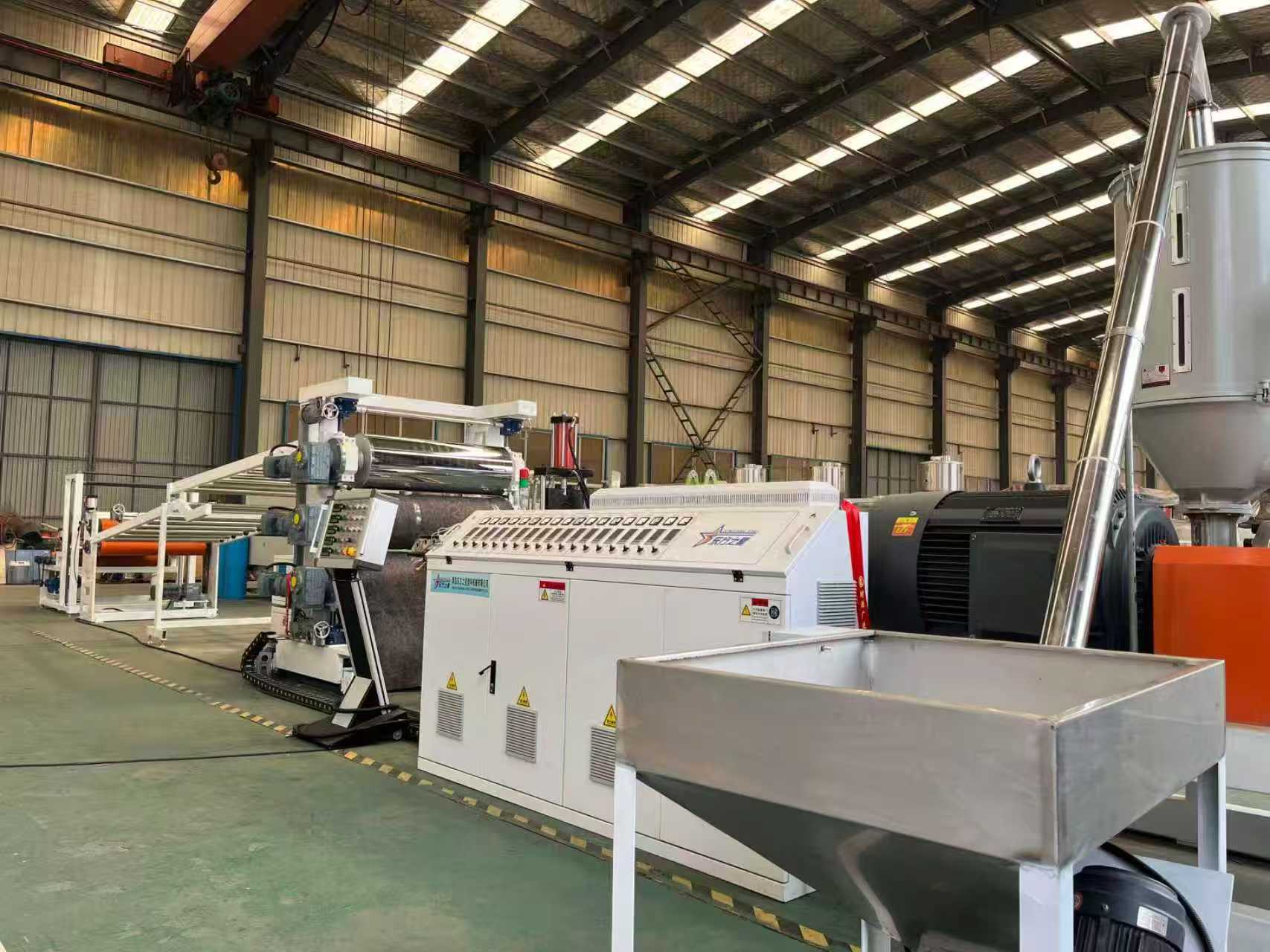 Trealamh mata frith-duillín TPE-1000mm mataí urláir gluaisteán: Is éard atá sa trealamh go príomha ná easbhrúiteoir aon-scriú, féilire trí-sorcóir, lúibín fuaraithe 6 méadar, meaisín tarraingthe sorcóir rubair, meaisín lomadh, agus gléas crios iompair.
